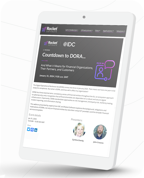 Ready to demystify the Digital Operational Resilience Act (DORA) before it transforms the financial landscape in 2025? Join guest speaker Duncan Brown from IDC, and Cynthia Overby and John Crossno from Rocket Software, for an insightful webinar that cuts through the complexity and spells out exactly what you need to know.